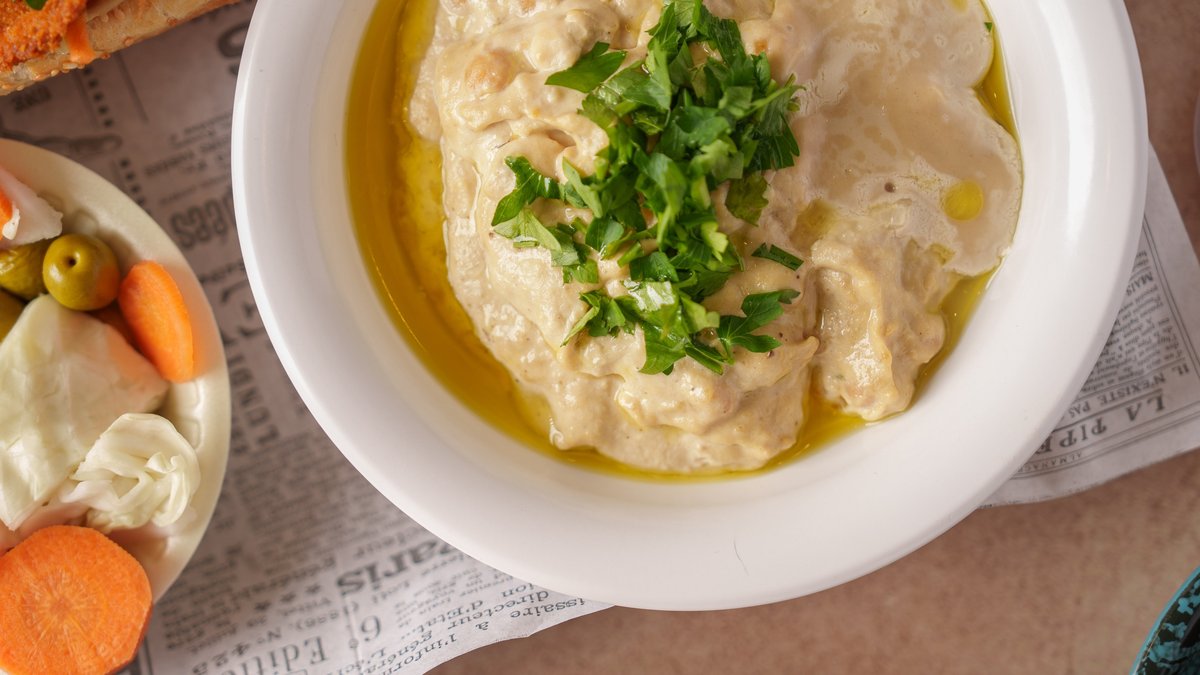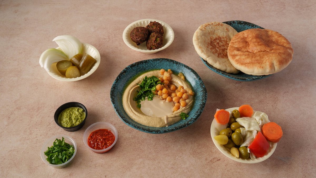 Rich hummus served with warm pita, spicy pickles, and falafel balls, alongside juicy meat dishes, fresh salads, and sweet desserts. Everything you need for the ultimate Israeli meal Kosher