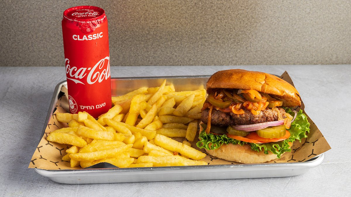 קציצה 100 גרם מבשר בקר עם חסה, עגבניה בצל סגול ומלפפון חמוץ מוגש עם צ׳יפס וטרופית