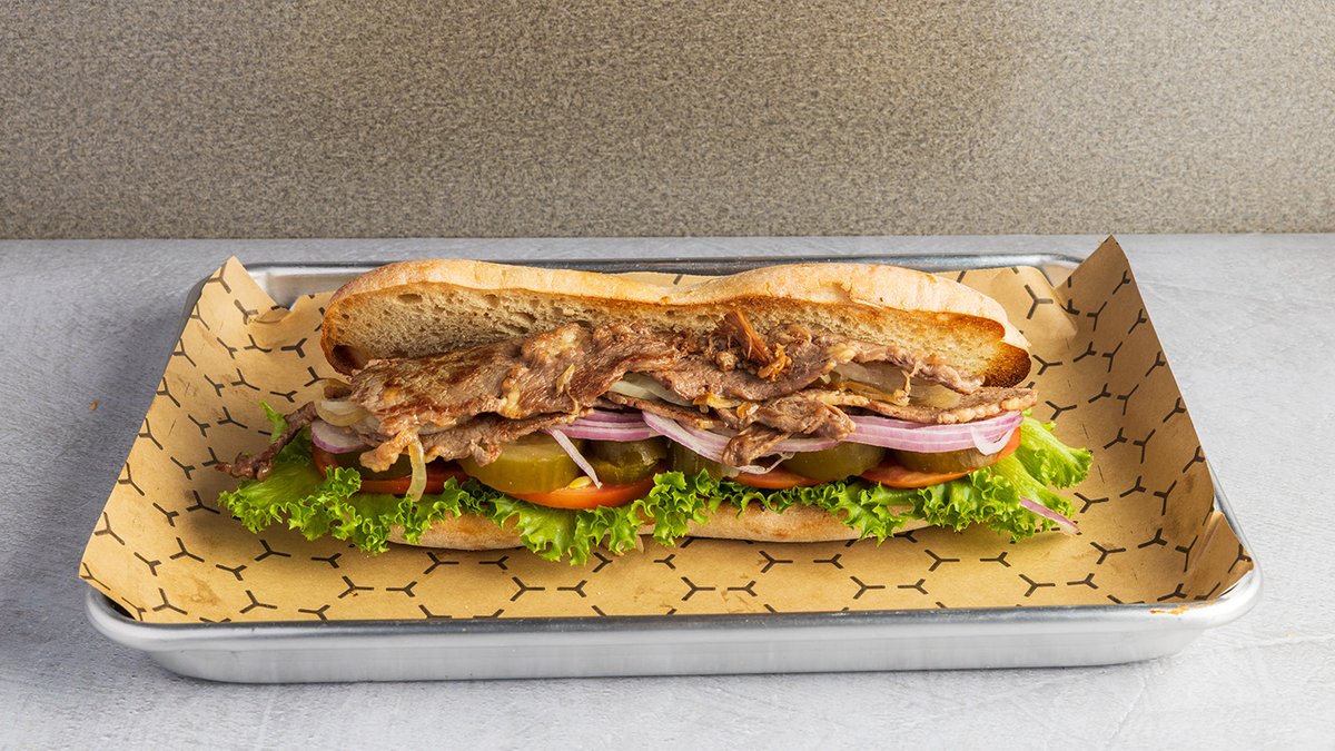 קציצה במשקל לבחירה עם רצועות אנטריקוט, בצל מטוגן, חסה, עגבניה, בצל סגול ומלפפון חמוץ