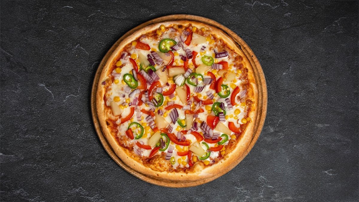 רוטב עגבניות, גבינת מוצרלה, בצל סגול, תירס, אננס, פלפל אדום ופלפל חריף