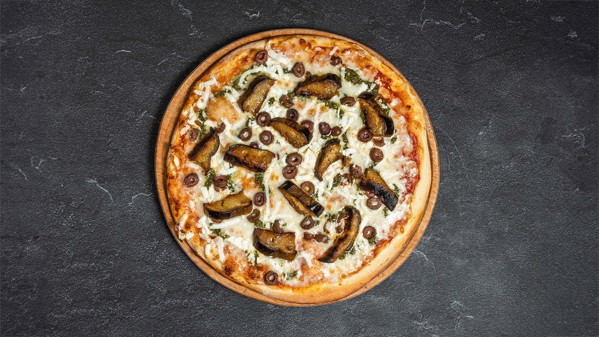 רוטב עגבניות, גבינת מוצרלה, רוטב פסטו, זיתים שחורים, חצילים ובולגרית