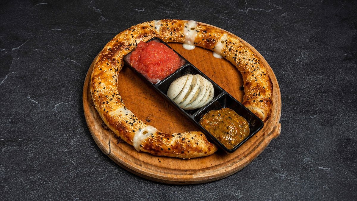 רוטב עגניות, גבינת מוצרלה, בצל מטוגן, בצל סגול, בצל לבן וירוק