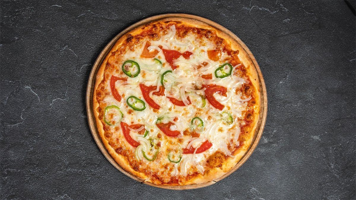 רוטב עגבניות, גבינת מוצרלה, בצל, עגבניות ופלפל ירוק חריף