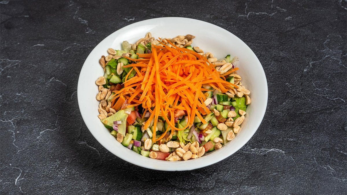 חסה, מלפפון, עגבניה, בצל סגול, רצועות גזר ובוטנים קלויים