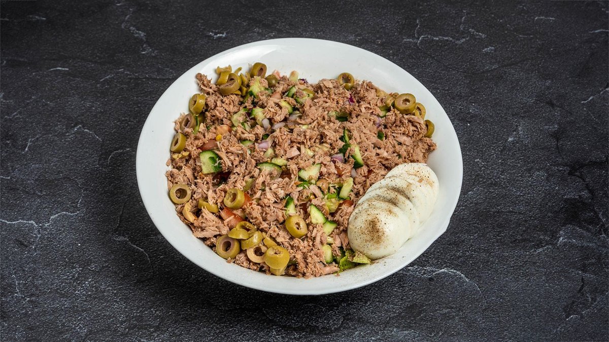חסה, מלפפון, עגבניה, בצל סגול, זיתים ירוקים, ביצה קשה וטונה