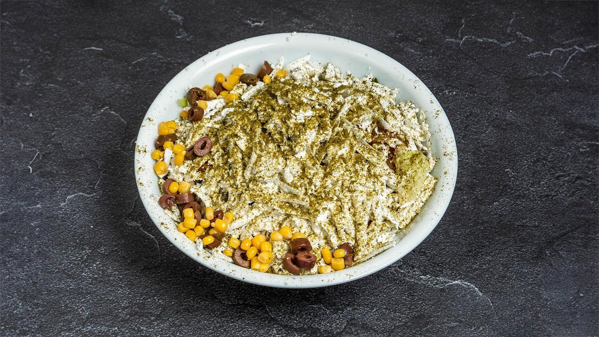 חסה, מלפפון, עגבניה, בצל סגול, תירס, זיתים שחורים וגבינה בולגרית