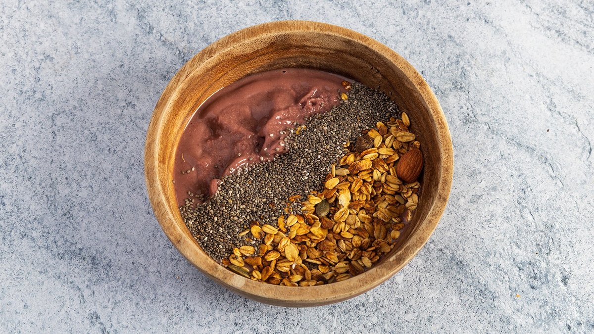 קערת סורבה מפרי האסאי טבעי לצד זרעי צ׳יה וגרנולה.