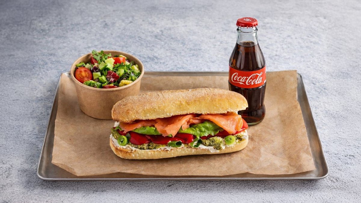 כריך נורדי מעושן, גבינת שמנת, חסה, פסטו, סלמון מעושן, פלפל קלוי, בצל סגול, בצל ירוק, מלח פלפל, שמן זית. 736 קלוריות, 24.5 חלבון, 31.4 שומן, 83.1 פחמימה.סלט ירקות אישי, חסה לאליק, עגבניית שרי, מלפפון, גמבה, בצל סגול. שתיה קלה לבחירה