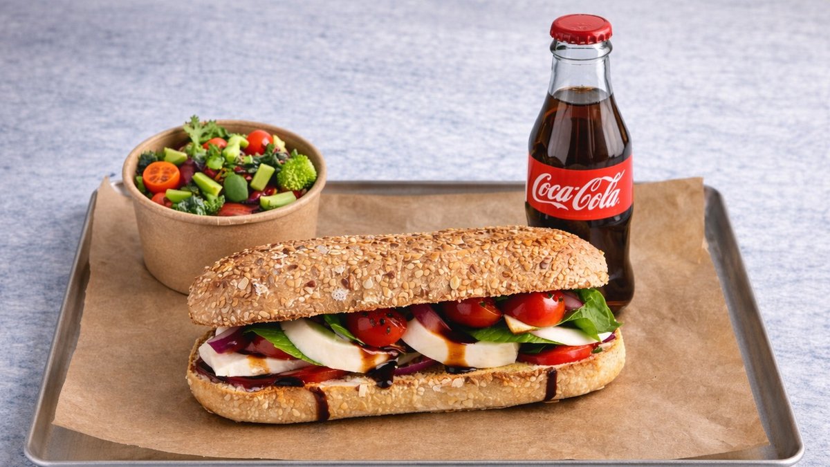 כריך קפרזה , מוצרלה פרסקה, עגבניות שרי, בצל סגול, בצל ירוק, מלח פלפל, שמן זית, ובלסמי מצומצם. 732 קלוריות, 30.4 חלבון, 31.4 שומן, 81.1 פחמימה.סלט ירקות אישי, חסה לאליק, עגבניות שרי, מלפפון, גמבה, בצל סגול.שתיה קלה לבחירה
