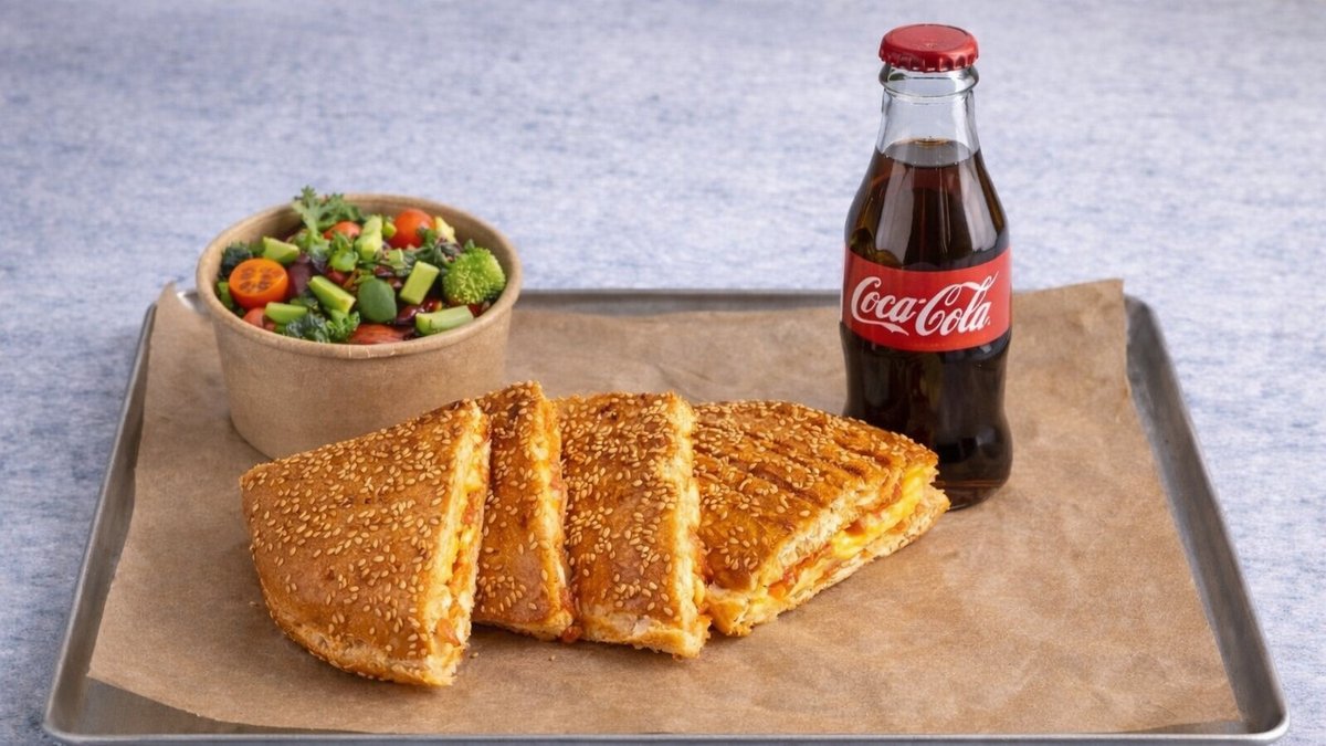 טוסט, רוטב פיצה, גבינה צהובה ותוספת לבחירה.סלט ירקות אישי, חסה לאליק, עגבניית שרי, מלפפון, גמבה, בצל סגול. שתיה קלה לבחירה