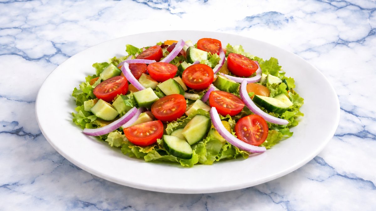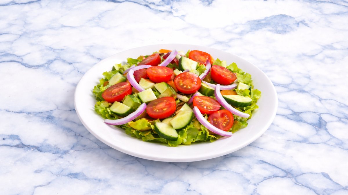 סלט ירקות מוגש עם לחם חסה לאליק, עגבניית שרי, מלפפון, גמבה, בצל סגול , מוגש עם לחם לבן/דגנים