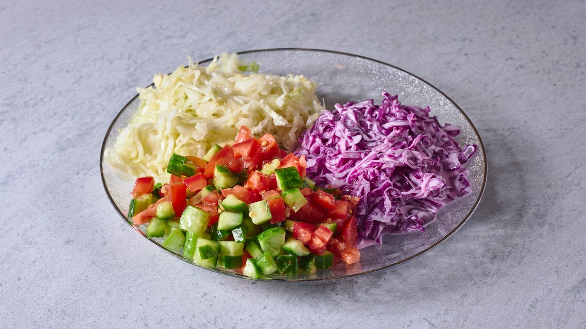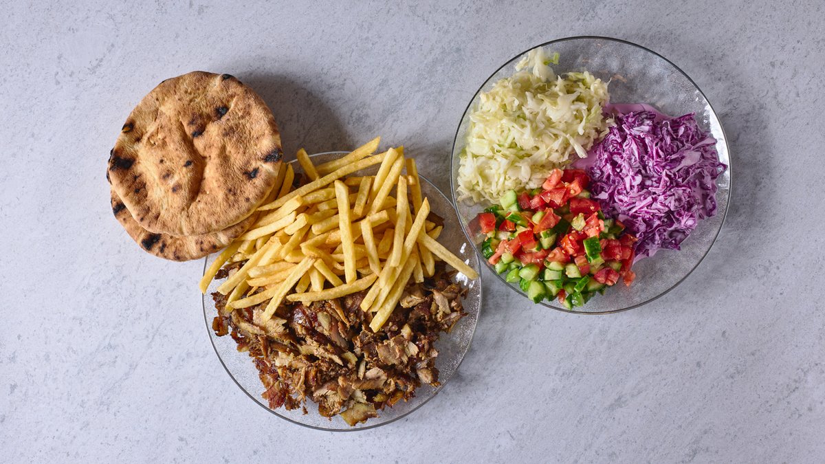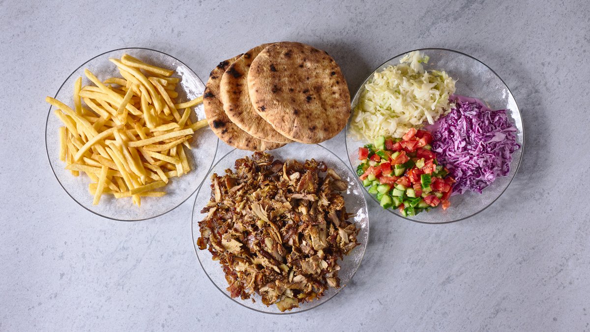 שווארמה, מיקס סלטים, צ׳יפס רגיל ו-2 לחם לבחירה