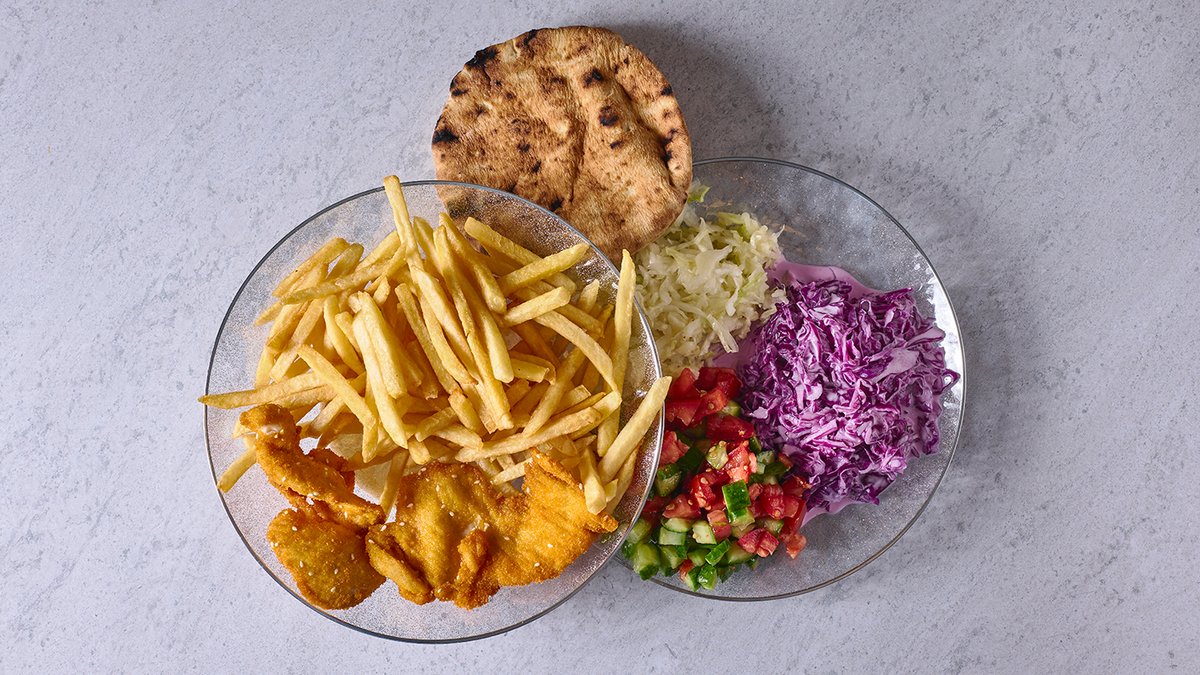 שניצל, מיקס סלטים, צ׳יפס אישי ולחם לבחירה