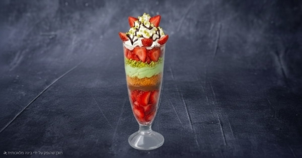 שכבות תותים, שיערות קדאיף, קרם פיסטוק, קרם אגוזי לוז ופיסטוק קלוי מעל