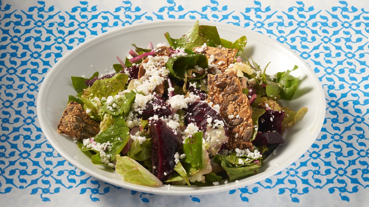 סלקים צלויים, עלי חסה, בצל סגול, פטה כבשים, בצל ירוק, אגוזי לוז, רוטב דבש לימון ושמן פפריקה מעושנת