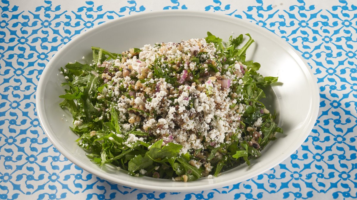 חיטה, בצל סגול, עדשים, עשבי תיבול, עגבניות, זוקיני, שקדים, פטה כבשים ורוטב יוגורט