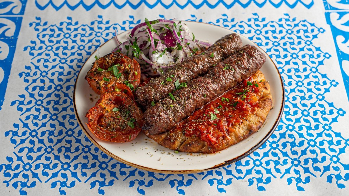 מוגש עם פיתה יוונית, עגבניות בגריל, בצל סגול אורגנו, פטרוזיליה, רוטב עגבניות, צזיקי, רליש שיפקה וטחינה