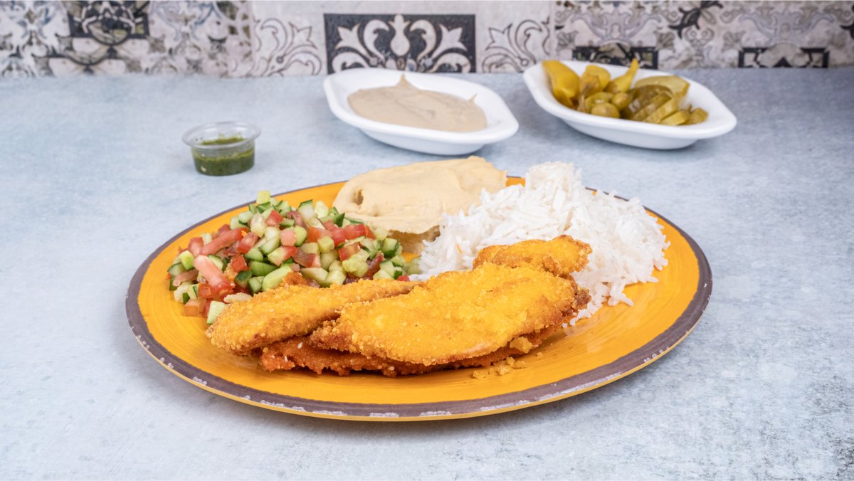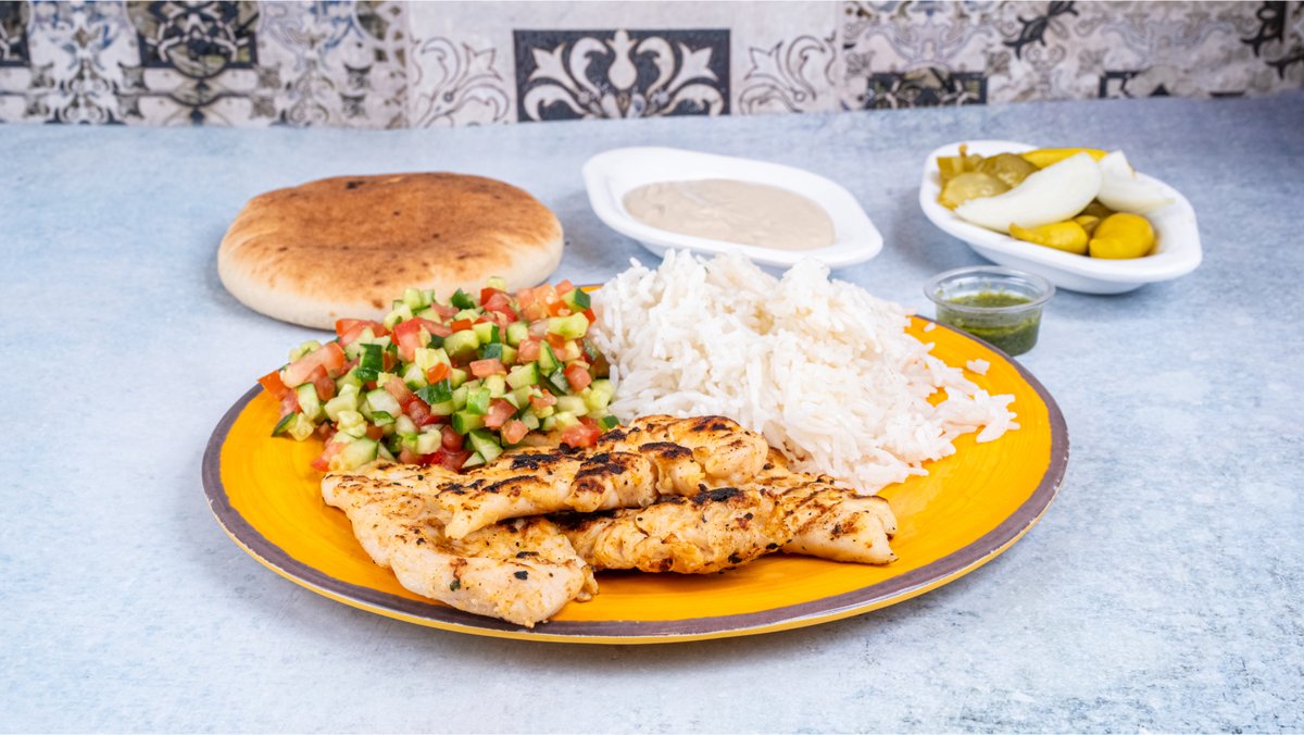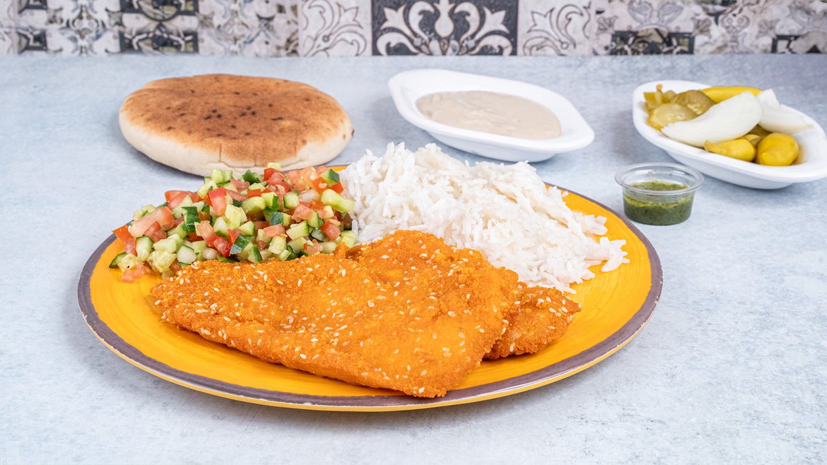 מוגש עם סלט ירקות, חומוס, פיתה ותוספת לבחירה