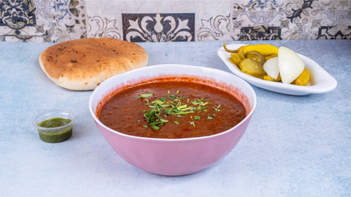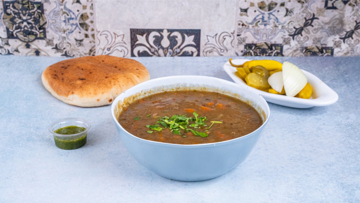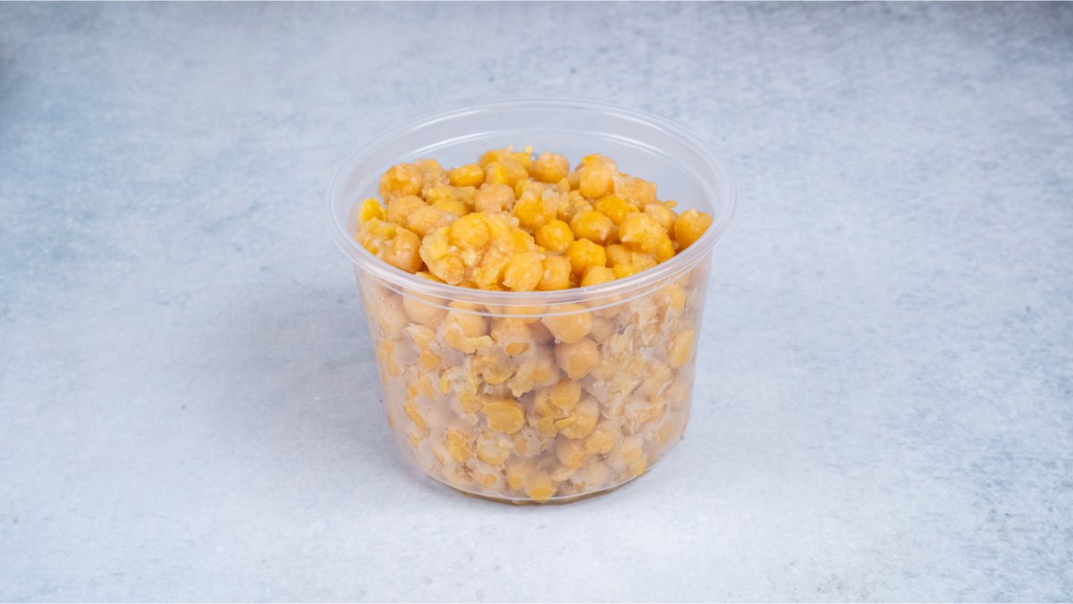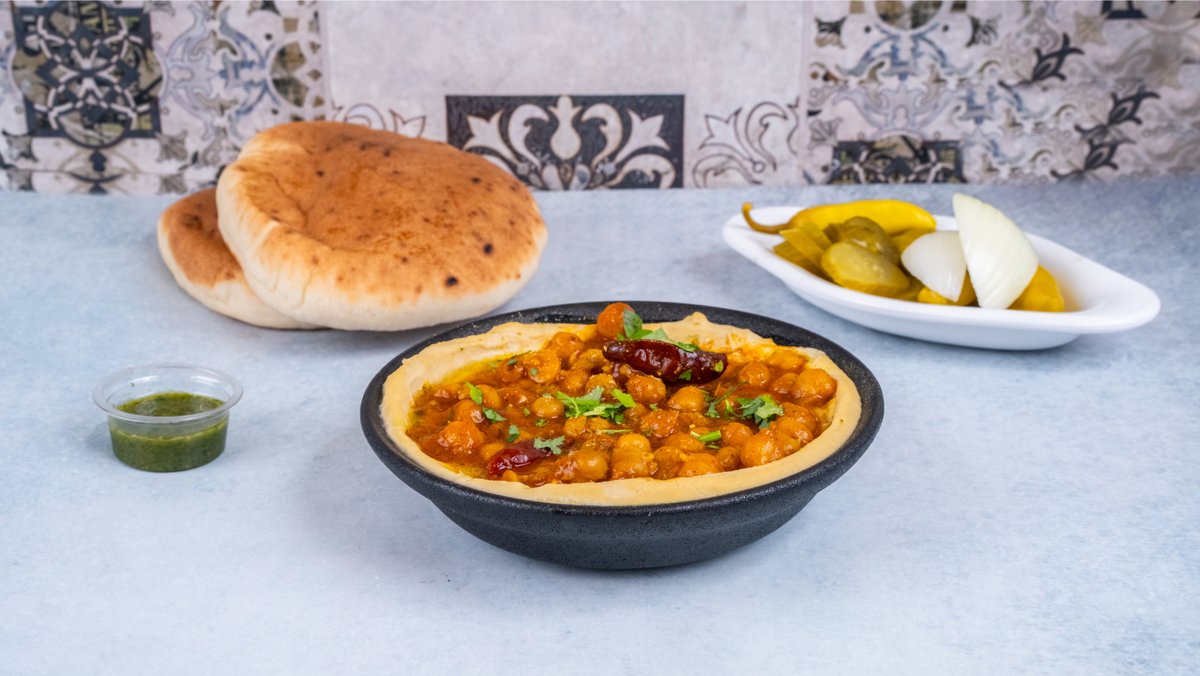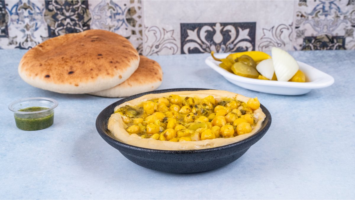 גרגירי חומוס מבושלים פיקנטי, מוגש עם 2 פיתות וחמוצים