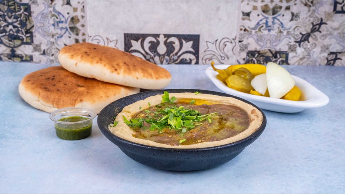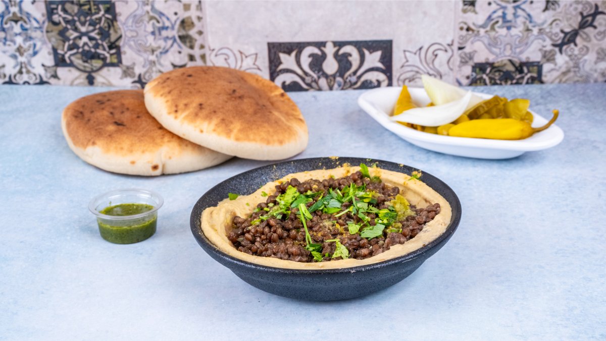 חומוס, טחינה, פול וגרגירי חומוס, מוגש עם 2 פיתות וחמוצים