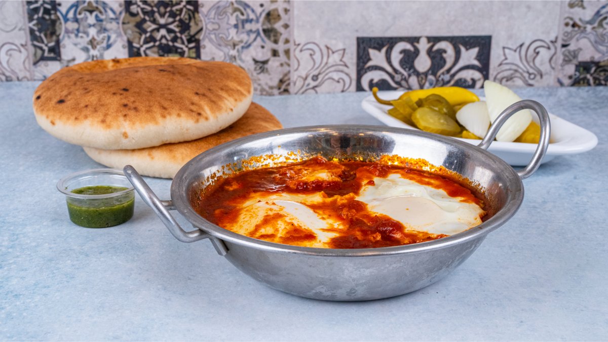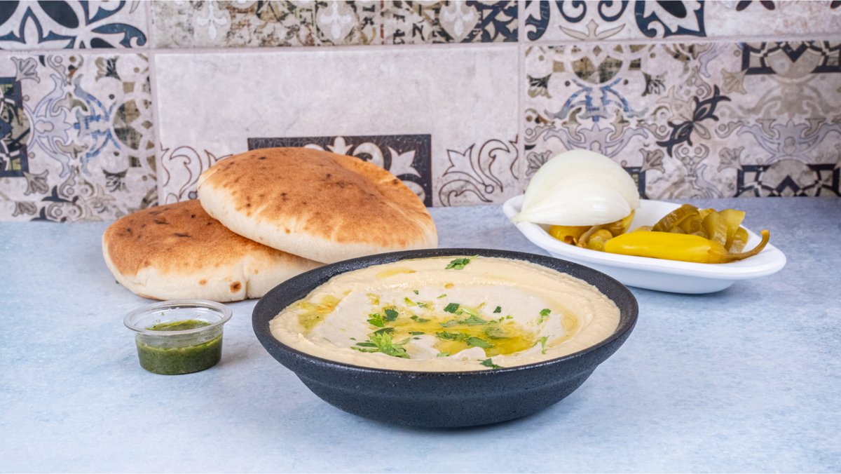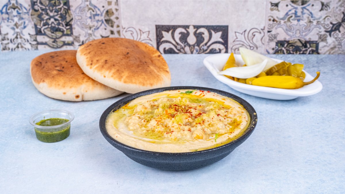 חומוס ושקשוקה, מוגש עם 2 פיתות וחמוצים