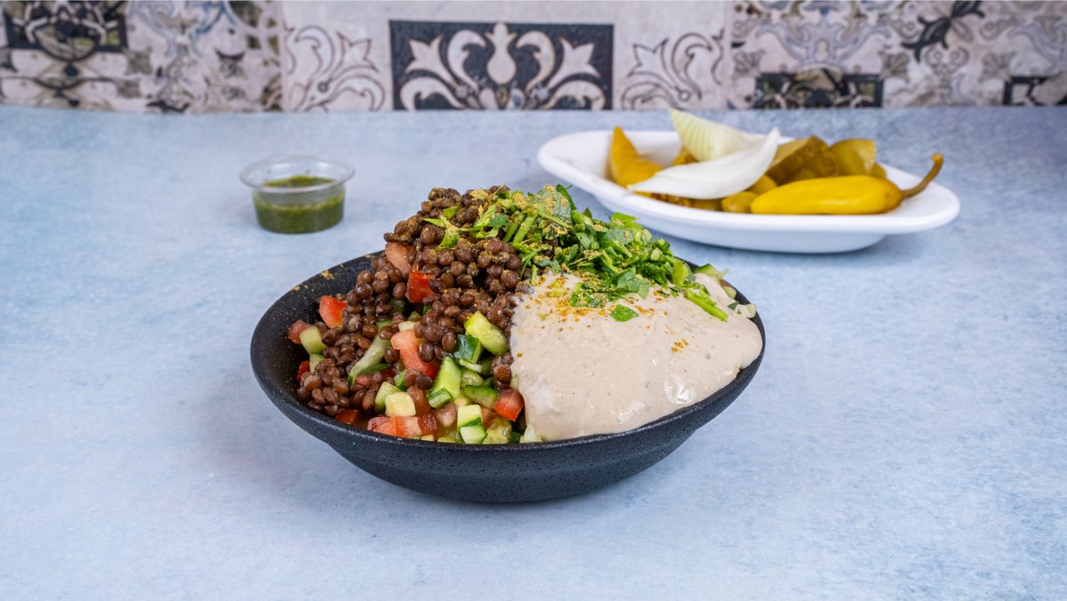 סלט ירקות, עדשים שחורות וגרגירי חומוס מבושלים בלימון מוגש עם טחינה בצד