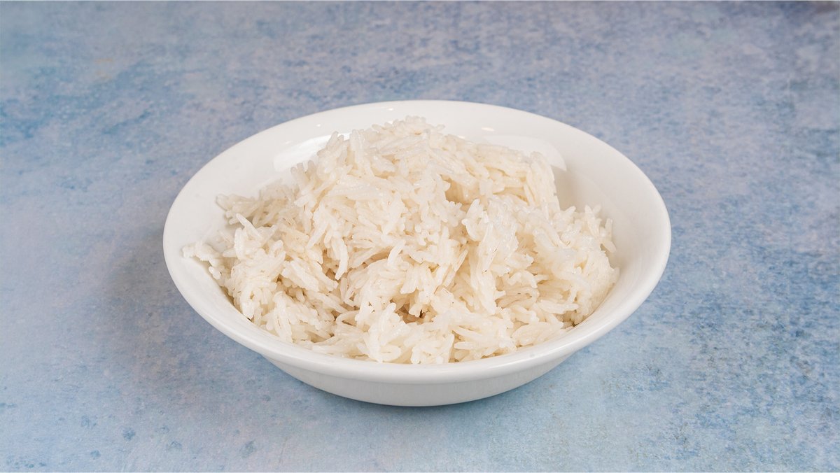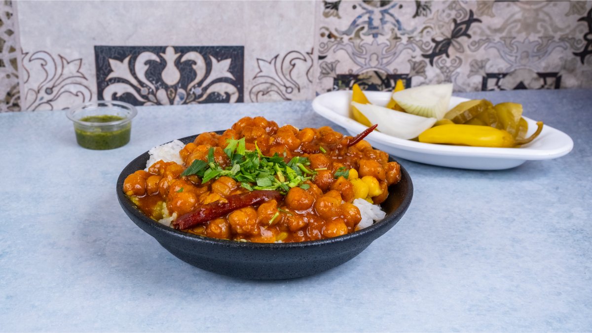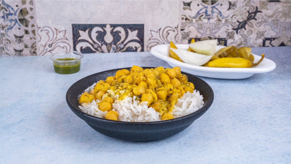 אורז לבן וגריגרי חומוס מתובלים חריפים, מוגש עם חמוצים בצד