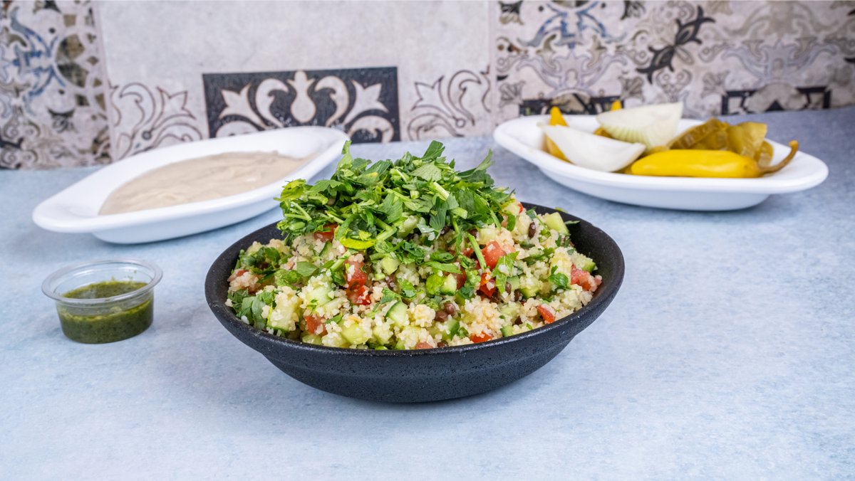 סלט ירקות, פטרוזיליה ובורגול מוגש עם טחינה בצד