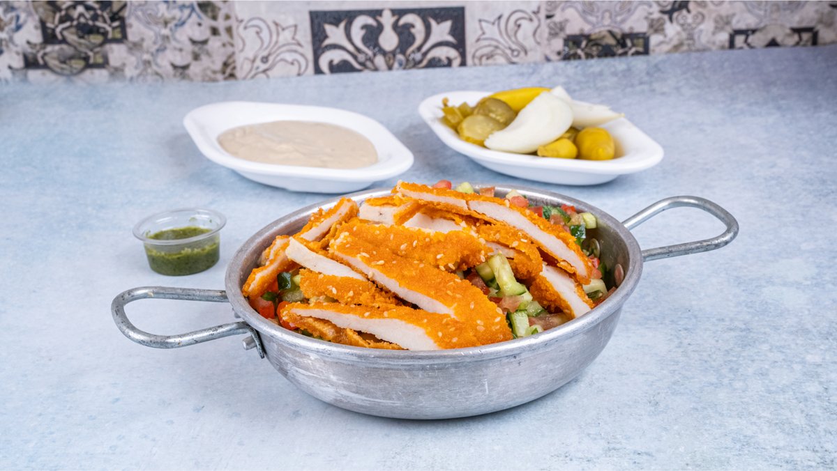 סלט ירקות ורצועות שניצל ביתי מוגש עם טחינה בצד
