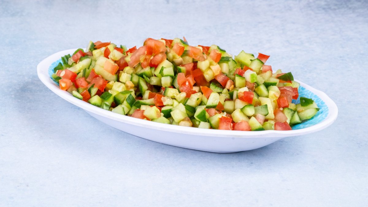 סלט ירקות באמצע, גרגירי חומוס וטחינה, מוגש עם 2 פיתות וחמוצים