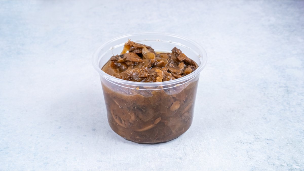 פטריות טריות מוקפצות בבצל, מוגש עם 2 פיתות וחמוצים