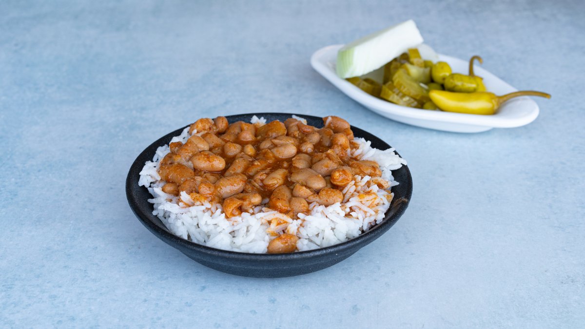 אורז לבן שעועית פיקנטית, מוגש עם חמוצים בצד