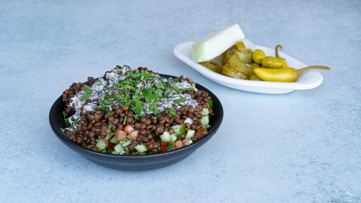 סלט ירקות ועדשים שחורות מוגש עם טחינה בצד