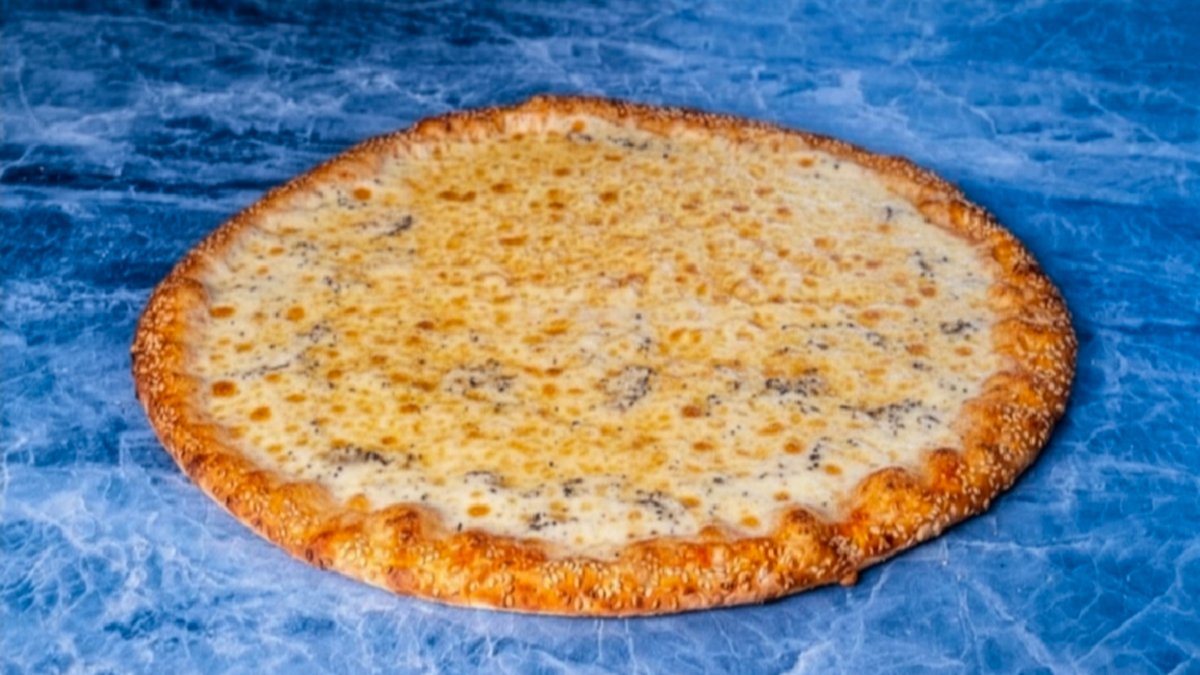 הפיצה בקוטר 45 ומגיעה עם שומשום על הקצוות (ניתן להוריד). מוגש לצד תבלין פיצה וצ'ילי גרוס
