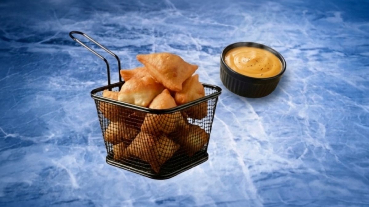 נגיסי בצק מטוגן, מוגש לצד רוטב צ'דר ביתי