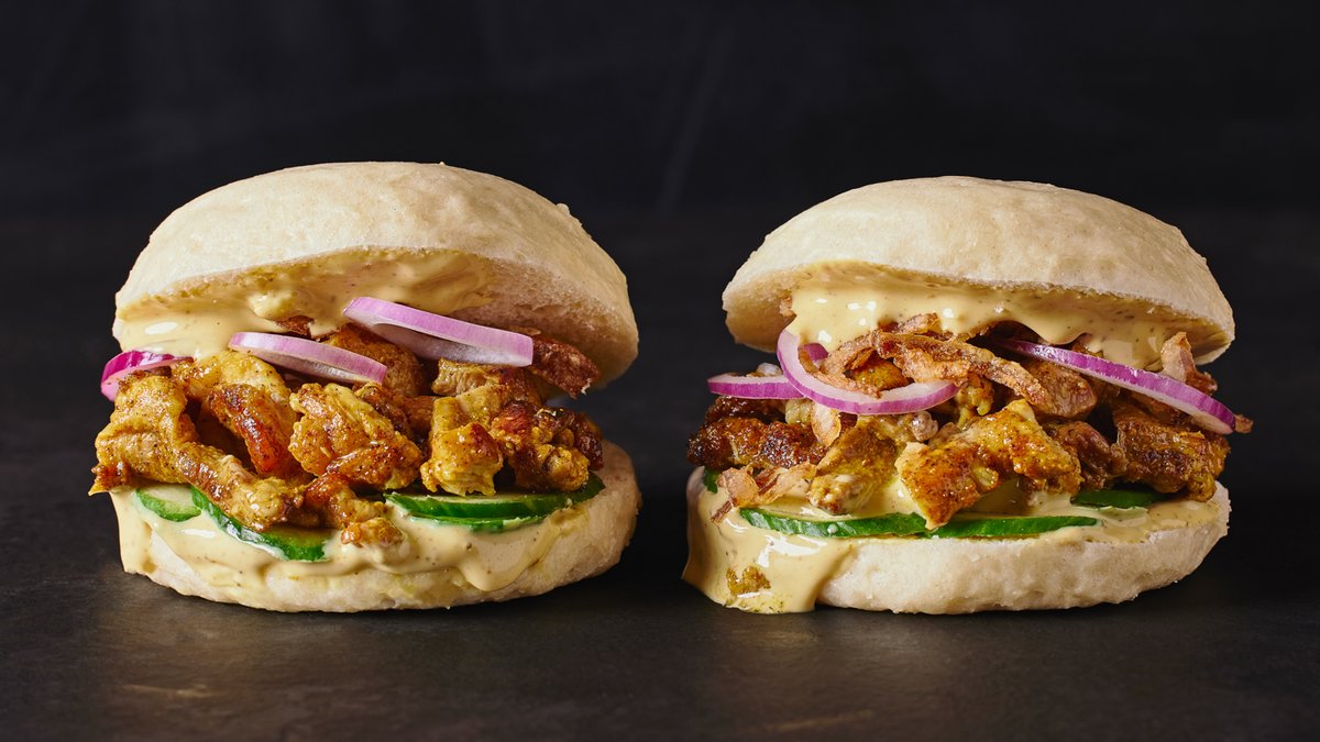שווארמה פרגית, טחינת עמבה, מלפפון מוחמץ, קריספי שאלוט, בצל סגול וממרח קארי | 2 יח׳