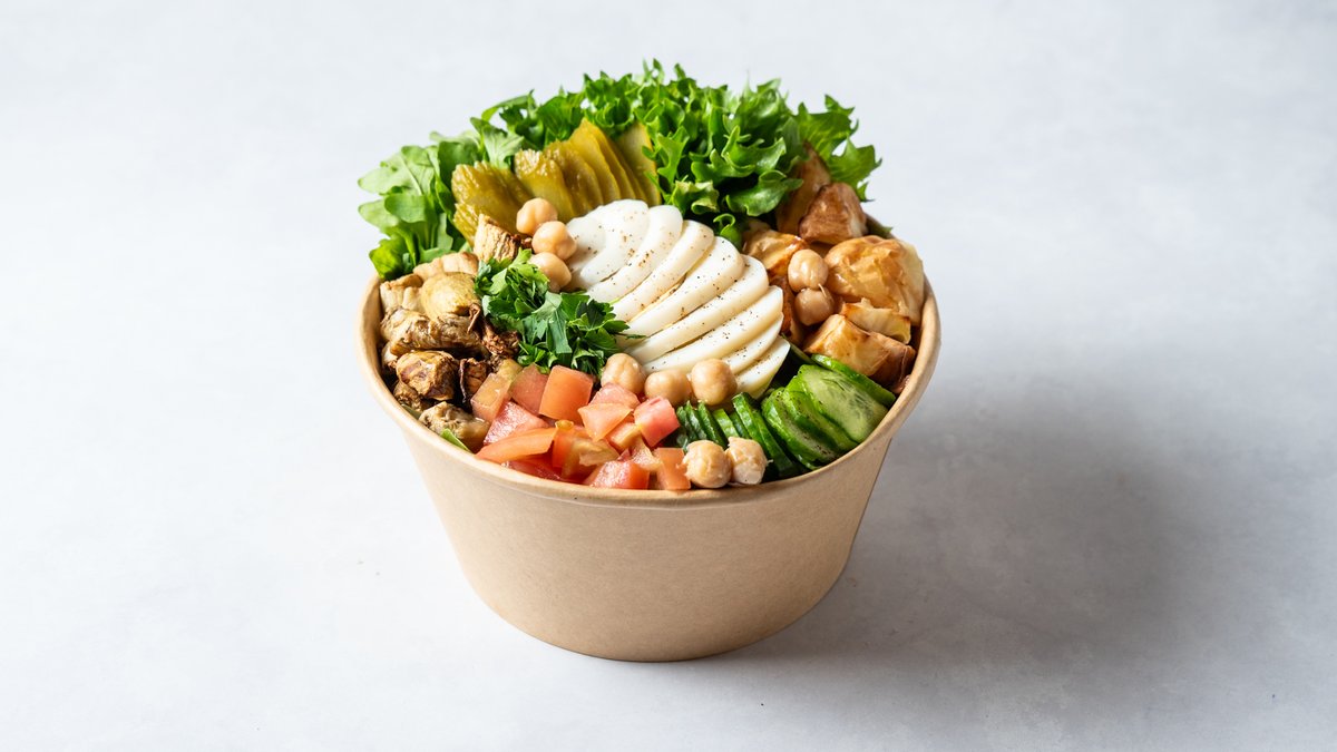 מיקס חסות, עגבניה, מלפפון, פטרוזיליה, תפוח אדמה מבושל, חציל, מלפפון חמוץ, חומוס גרגירים מתובל, ביצה קשה,