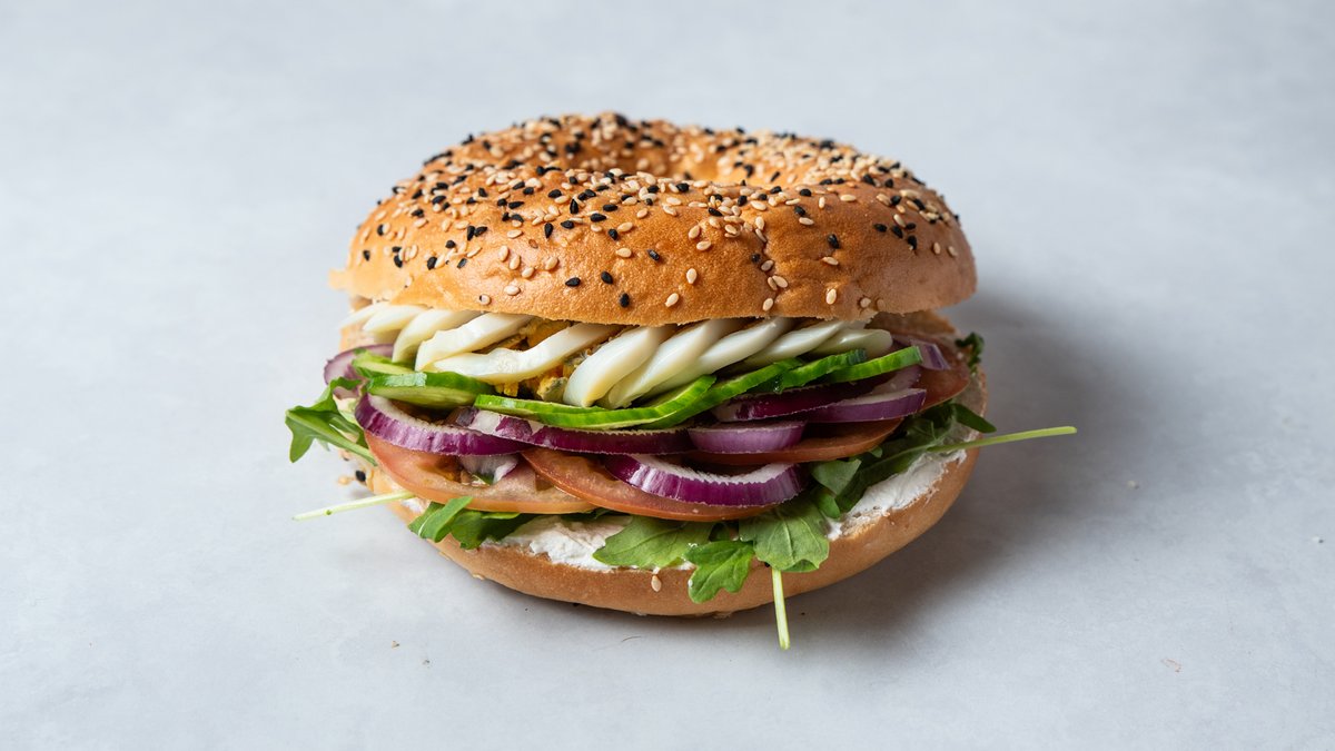 גבינת שמנת, ביצה, עלי רוקט, מלפפון, עגבניה ובצל סגול