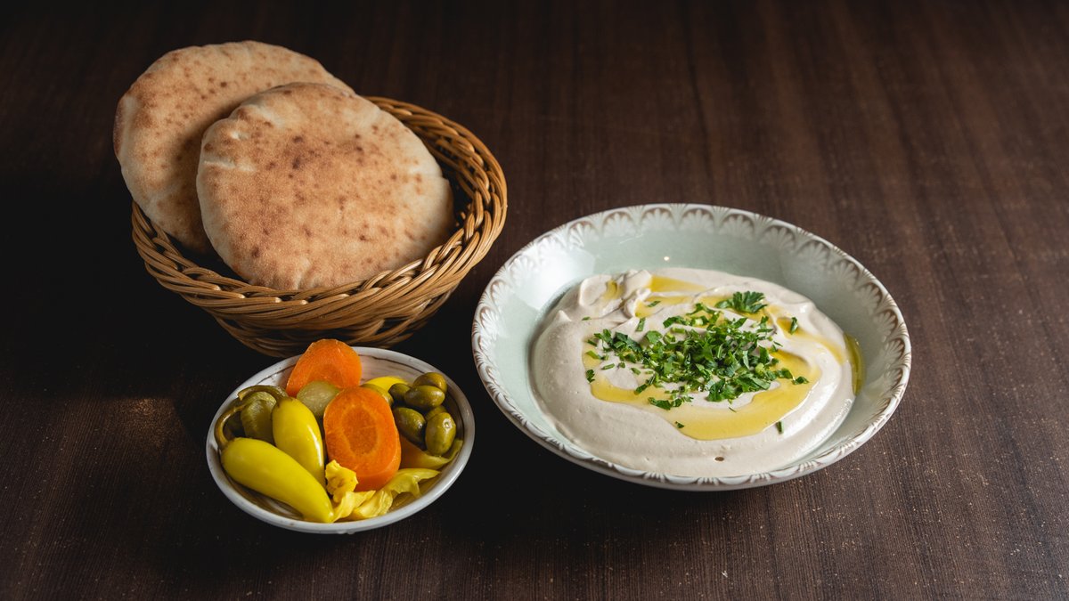 טחינה עם שמן זית ופטרוזיליה | מוגש עם 2 פיתות וחמוצים