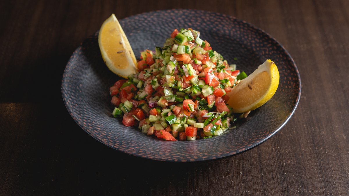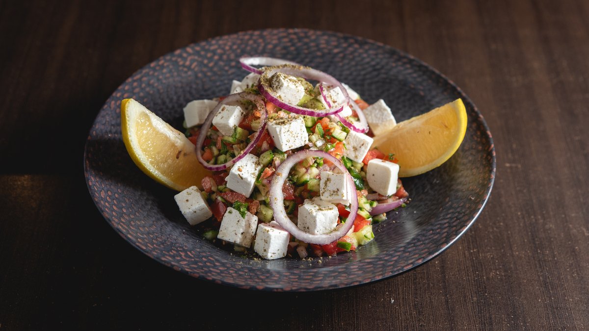 עגבניה, מלפפון, זיתים שחורים, בצל סגול, גבינה בולגרית ושמן זית | מוגש עם לחם הבית