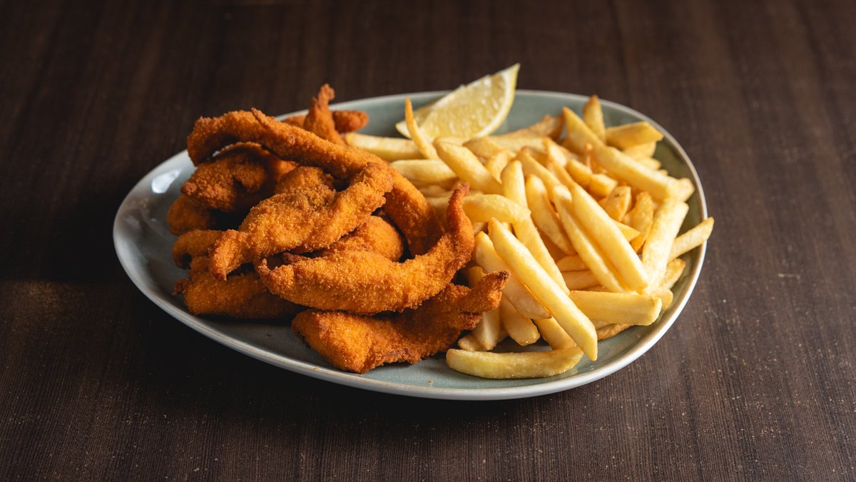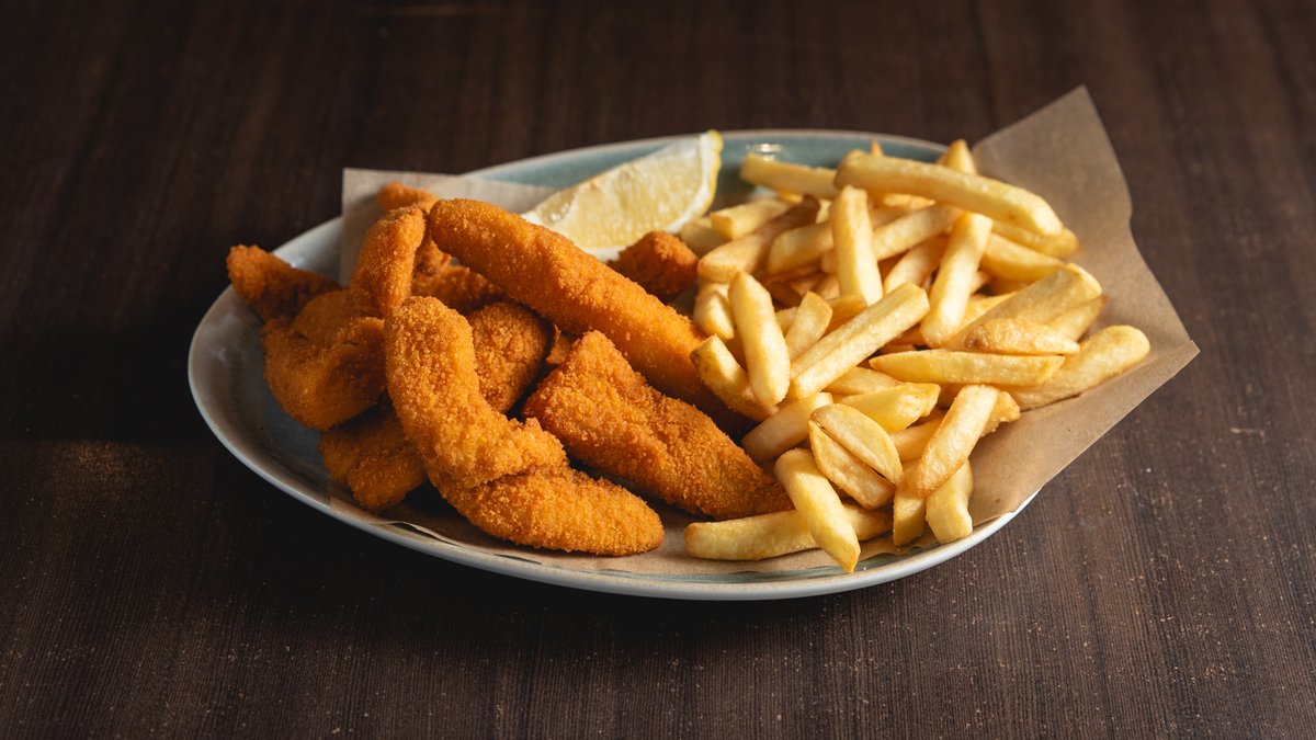 חתיכות פילה דג לבן מטוגן עם צ׳יפס