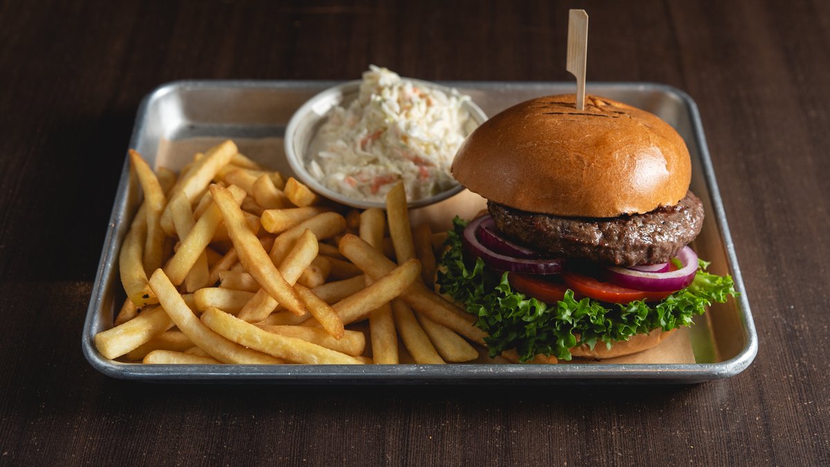המבורגר 220 גרם עם עגבניה, בצל וחסה | מוגש עם צ׳יפס