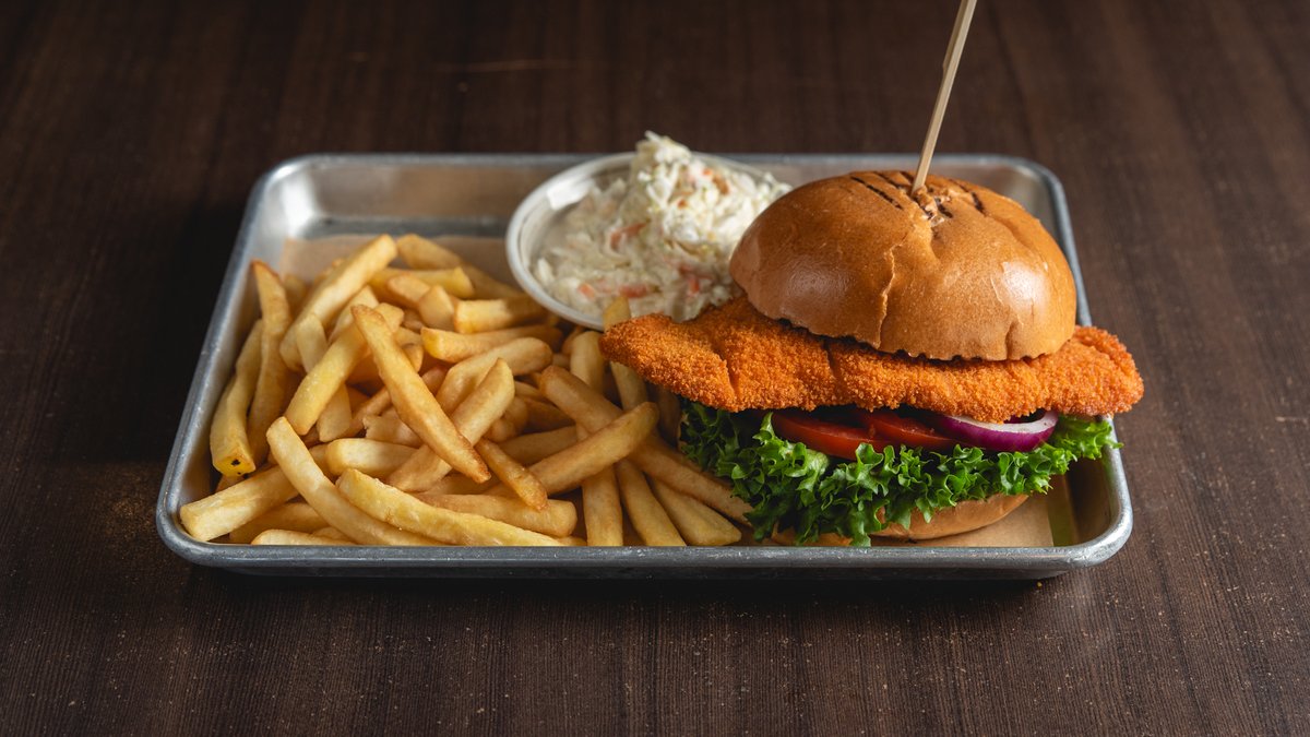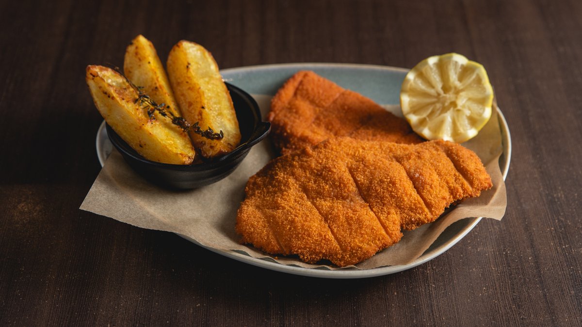 חזה עוף מטוגן בפירורי לחם עם חסה, עגבניה ובצל | מוגש עם צ׳יפס