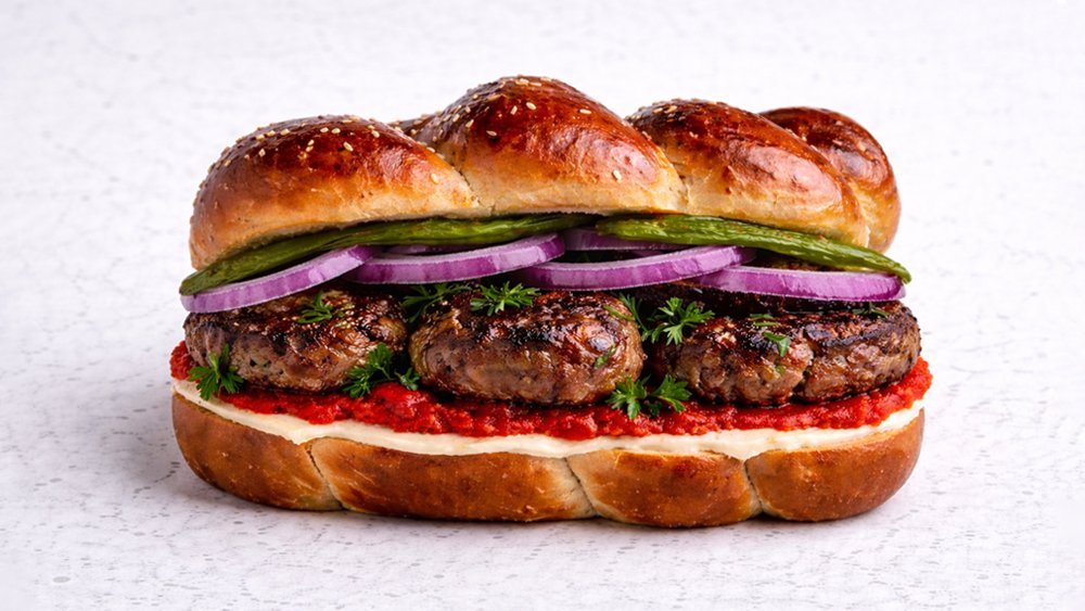 קציצות קבב עשויות בגריל בחלה טריה אישית עם ממרחים וסלטים לבחירה בליווי טחינה ומיקס חמוצים