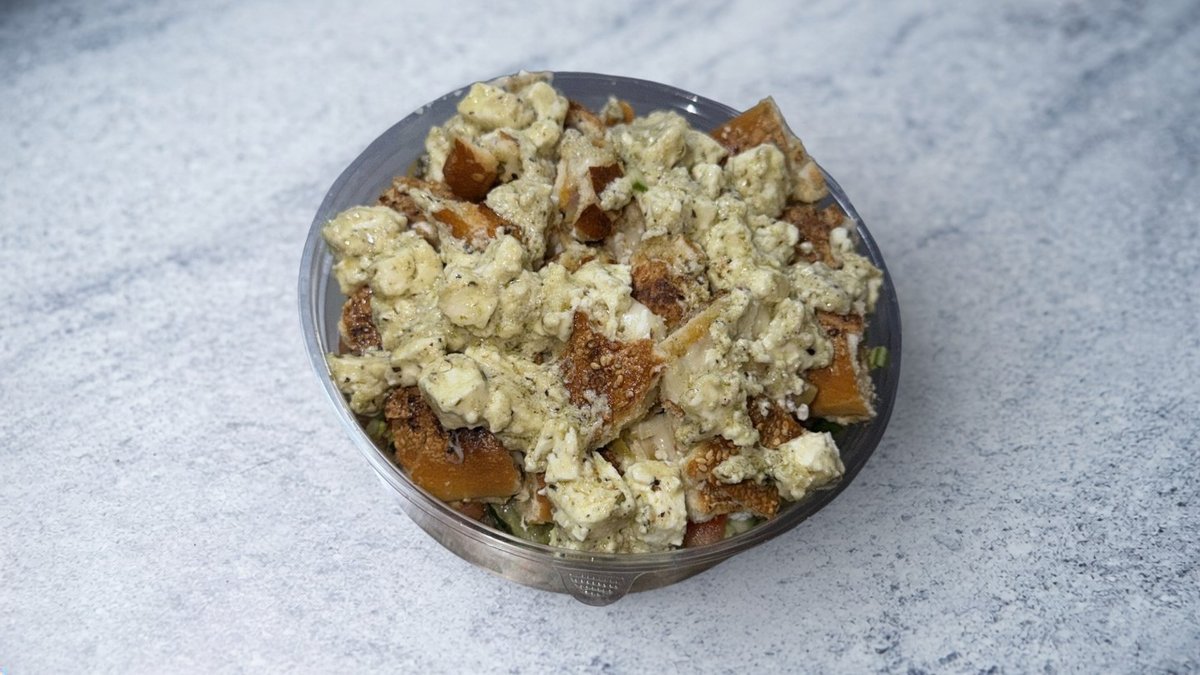 חסה, מלפפון, עגבניה, בצל סגול, בתוספת קוביות טוסט מוקפצות בחמאת שום ובולגרית