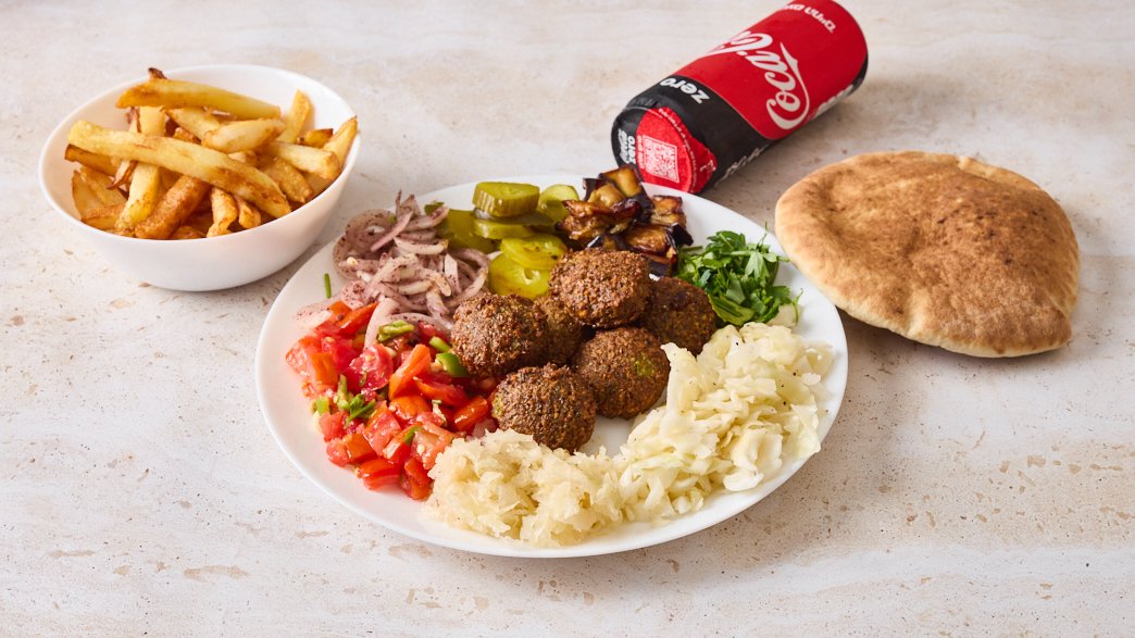 7 כדורי פלאפל, צ׳יפס, שתיה לבחירה, מוגש עם פיתה ו3 סוגי סלטים