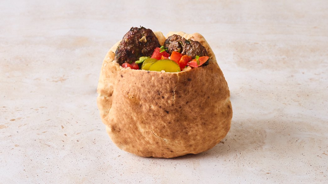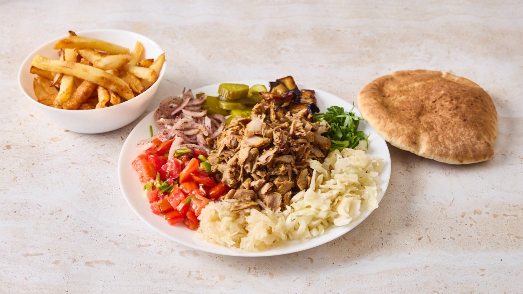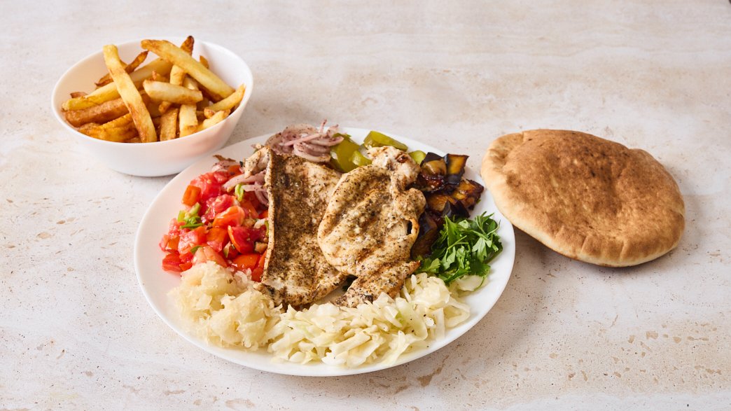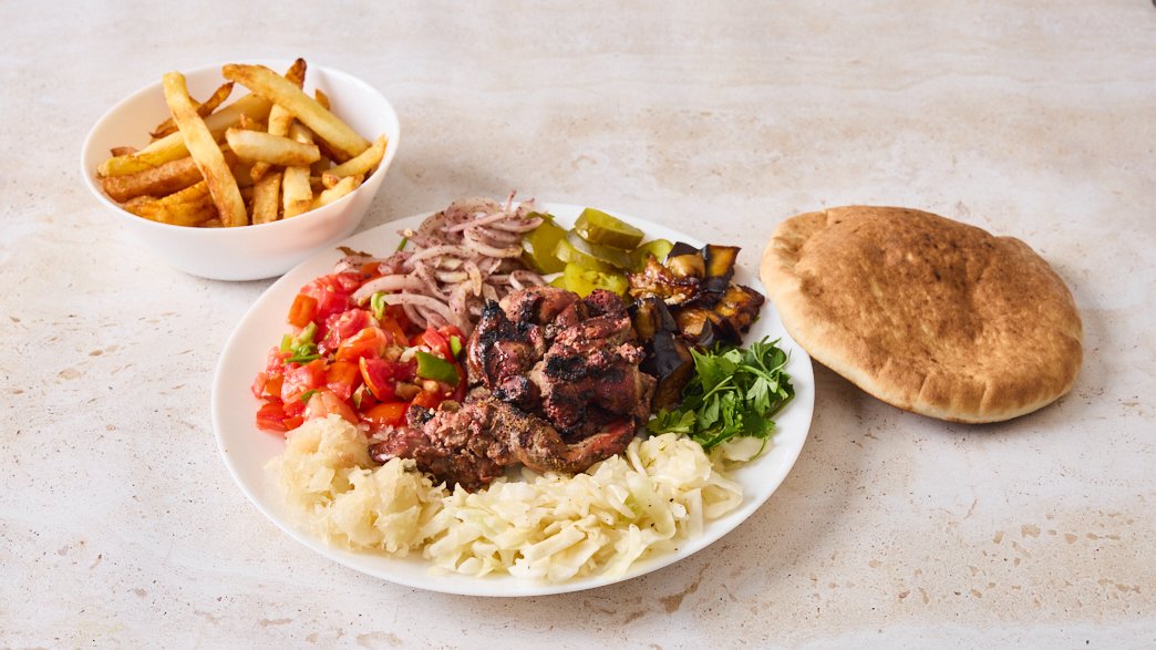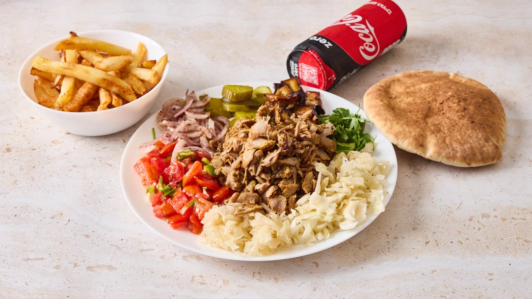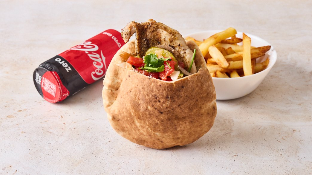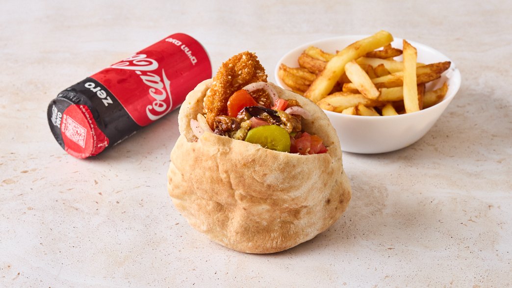 פיתה עם בשר לבחירה, צ׳יפס ושתייה לבחירה
