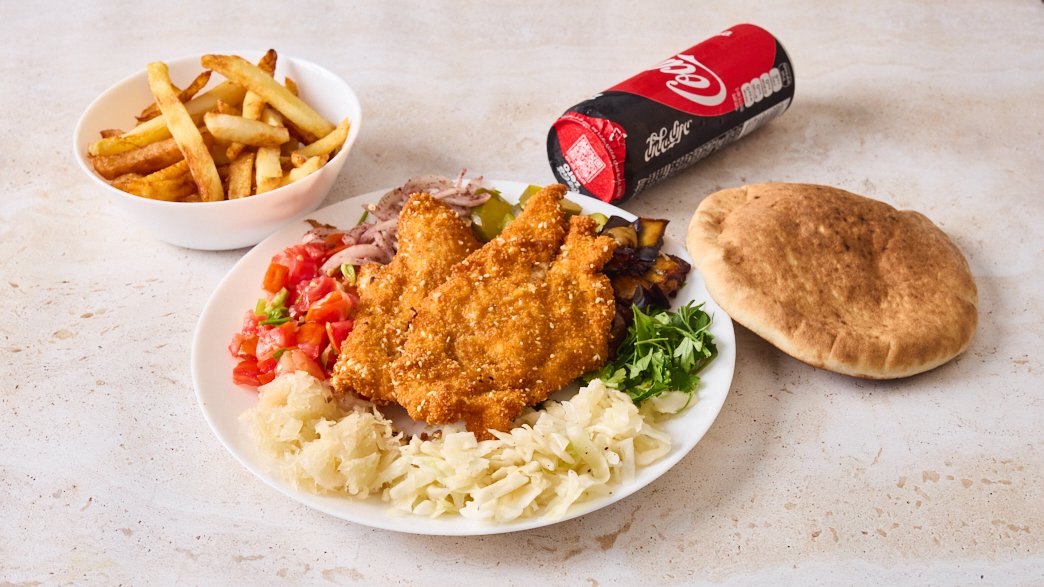 פיתה עם שניצל, 3 סוגי סלטים, שתיה וצ׳יפס