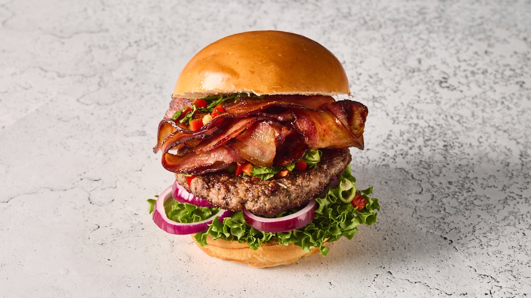 קציצה 220 גר', לחמנית בריוש, איולי פלפלים, חסה, בצל סגול, צ'מצ'ורי, בייקון טלה