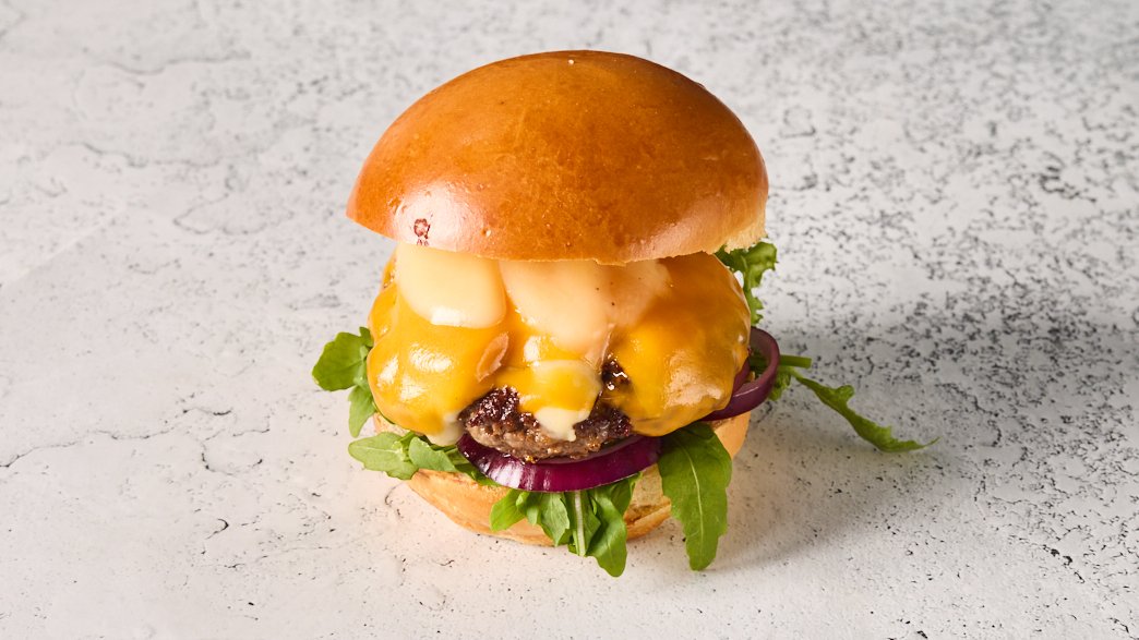 קציצת בקר 220 גר', איולי פלפל, אורוגולה, בצל סגול, פרוסות שייטל בקר וגבינת גאודה